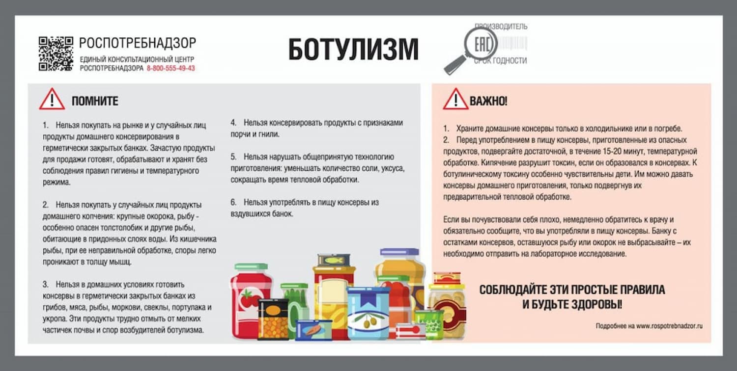 Помните, что запах, цвет и вкус консервированного продукта при развитии в нем ботулизма не меняется. Вот почему к домашнему консервированию надо подходить со всей серьезностью и ответственностью. Строго выполняйте все технологические и санитарные рекомендации при переработке плодов и овощей, соблюдайте все меры предосторожности. Советуем по возможности заменить, консервирование, солением и мочением овощей и плодов, которое позволяет не применять герметичное укупоривание.