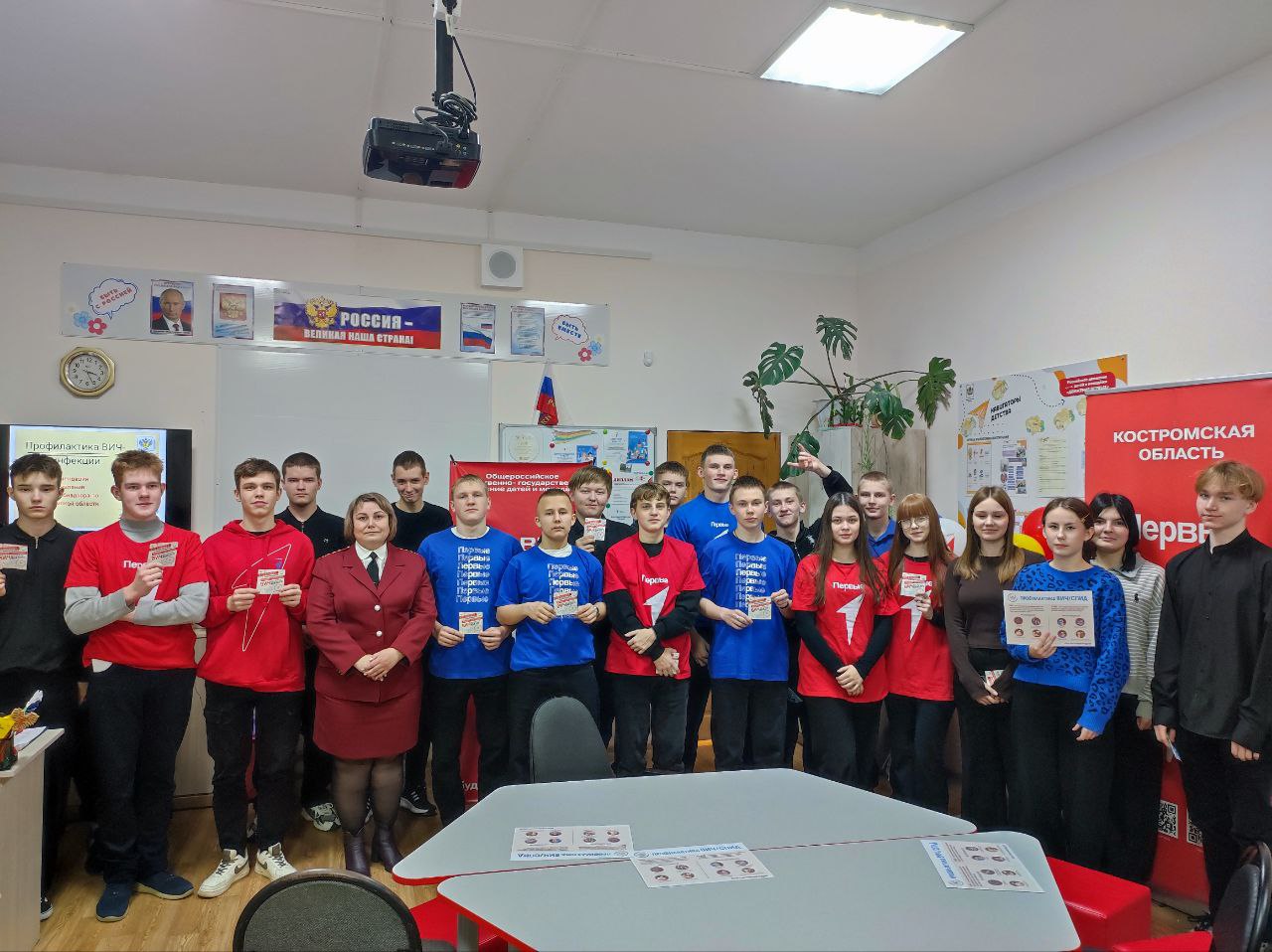 В рамках реализации четвертого этапа просветительского проекта Лектория «Санпросвет», реализуемого в рамках коммуникационной стратегии «Санпросвет» федерального проекта «Санитарный щит страны - безопасность для здоровья (предупреждение, выявление, реагирование) специалисты территориального отдела Управления Роспотребнадзора по Костромской области в Шарьинском районе совместно с членами первичного отделения Российского движения детей и молодёжи «Движение первых» во Всемирный день борьбы со СПИДом, который отмечается 1 декабря, провели познавательную беседу в формате живого общения со старшеклассниками МОУ «Вохомская средняя общеобразовательная школа» Вохомского муниципального района Костромской области о профилактике, диагностике и методах лечения ВИЧ-инфекции.